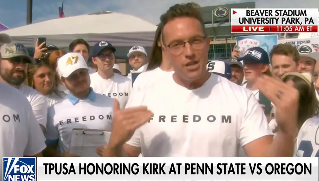 A number of Penn State football fans were seen wearing Charlie Kirk’s “FREEDOM” T-shirts at Saturday night’s game against Oregon.