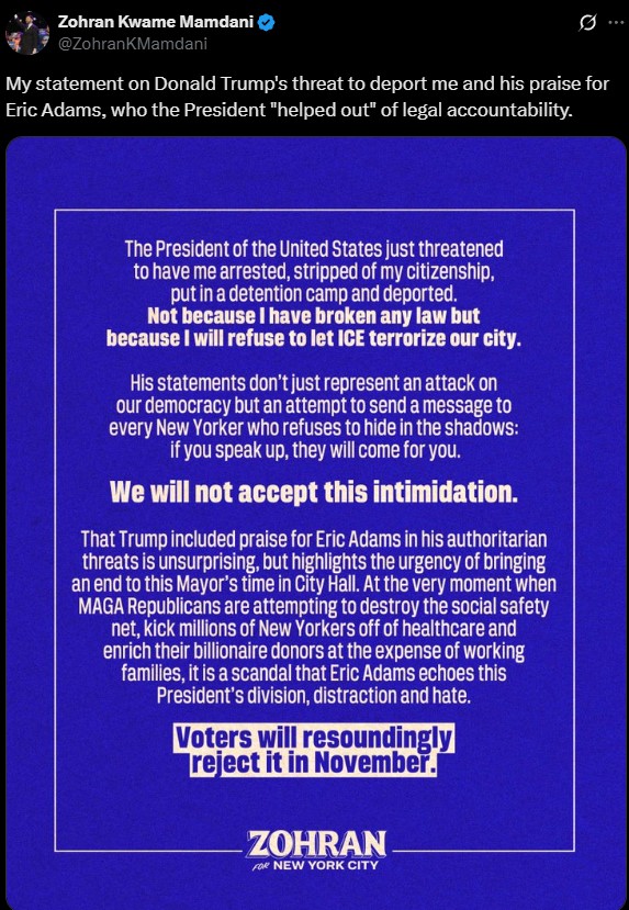 “If Mamdani lied on his naturalisation documents, he doesn’t get to be a citizen, and he certainly doesn’t get to run for mayor of New York City. A great American city is on the precipice of being run by a communist who has publicly embraced a terroristic ideology,” Andy Ogles, from the Republican party, said in a news release dated 29 October, after asking US Attorney General Pam Bondi to investigate Mamdani.