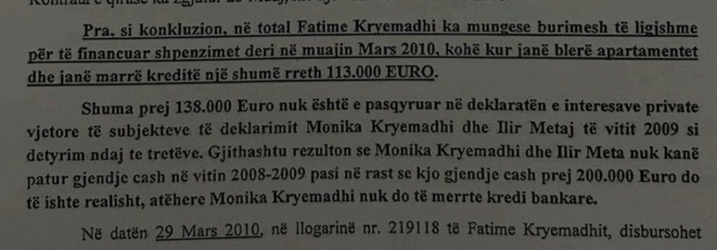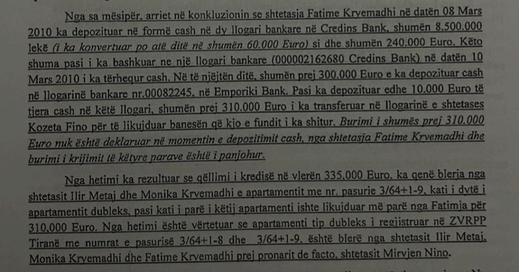 Në vitin 2010, Fatime Kryemadhi ka futur qindra mijëra euro cash në sistemin bankar, për të mbuluar blerjen e pasurive të paluajtshme nga Ilir Meta dhe Monika Kryemadhi.