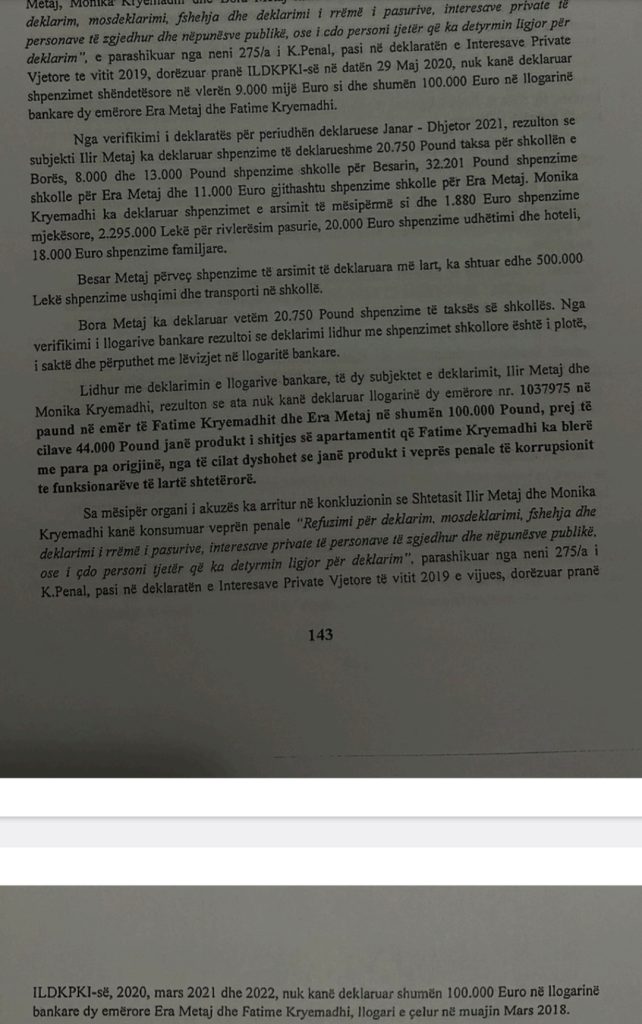 “Nga hetimi ka rezultuar se shtetasit I.M. dhe M.K. nuk kanë deklaruar shpenzimet mjekësore të kryera gjatë periudhës 2013-2019, në vlerën totale prej 106.125 Euro. Nga këto shpenzime, 86.891 Euro janë paguar në cash. Hetimet kanë zbuluar se në deklaratën e Interesave Private Vjetore për vitin 2019, të dorëzuar në ILDKPKI më 29 Maj 2020, këta subjekte nuk kanë deklaruar shpenzimet shëndetësore në vlerën prej 9.000 Euro të kryera në një klinikë private jashtë vendit si dhe dhe shumën 100.000 Euro në llogarinë bankare dy emërore, të cilat i përkasin E.M. dhe F. K. Subjektet I.M. dhe M. K. dyshohet se kanë konsumuar veprën penale “Refuzimit për deklarim, mosdeklarimi, fshehja dhe deklarimi i rrëmë i pasurive, interesave private të personave të zgjedhur dhe nëpunësve publikë” parashikuar nga neni 275/a të Kodit Penal”.