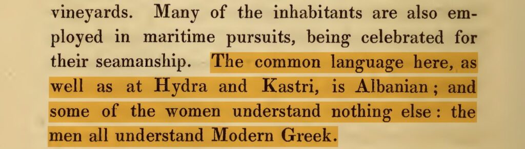 “Gjuha e përbashkët këtu, si dhe në Hidra dhe Kastri, është shqipja; dhe disa nga gratë nuk kuptojnë asgjë tjetër: burrat të gjithë e kuptojnë greqishten moderne.”