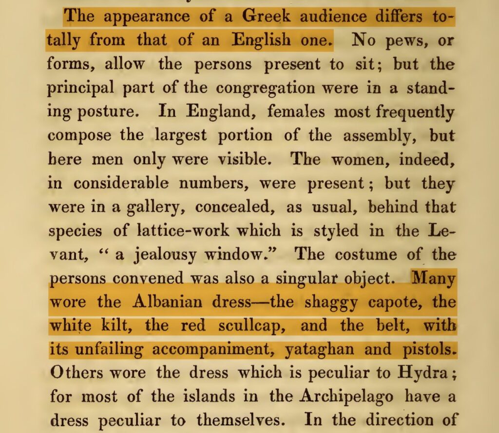 “Kostumi i personave të mbledhur ishte gjithashtu një objekt i veçantë. Shumë prej tyre mbanin veshjen shqiptare—tallaganin (capote) leshtor, kiltin e bardhë (fustanellën), kësulën e kuqe dhe rripin, me shoqëruesit e tyre të pandashëm, jataganin dhe pistoletat.”