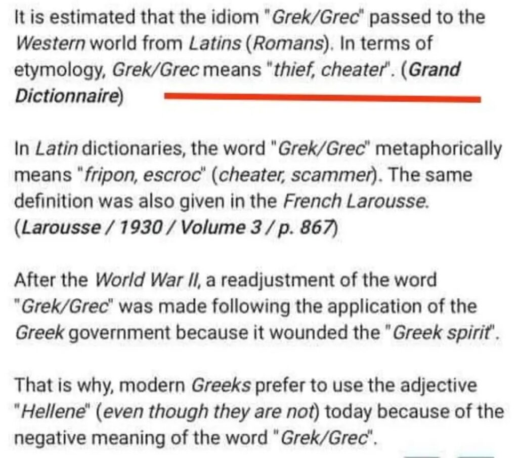 “Në fjalorët latinë, fjala ‘Grek/Grec’ metaforikisht do të thotë ‘fripon, escroc’ (mashtrues, vjedhës). I njëjti përkufizim është dhënë edhe në Larousse-in francez (vëllimi 3, fq. 867, viti 1930).”