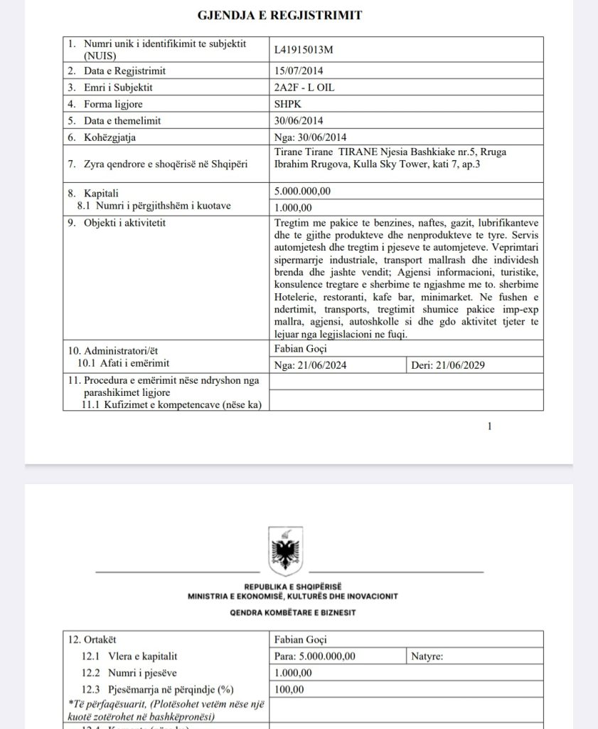 Fabian Goçi është pronar edhe i kompanisë tjetër të karburanteve 2A2F – L OIL, me nipt L41915013M. Përmes kësaj kompanie ka përfituar 130 mijë euro nga buxheti i shtetit, kryesisht nga pushteti vendor.