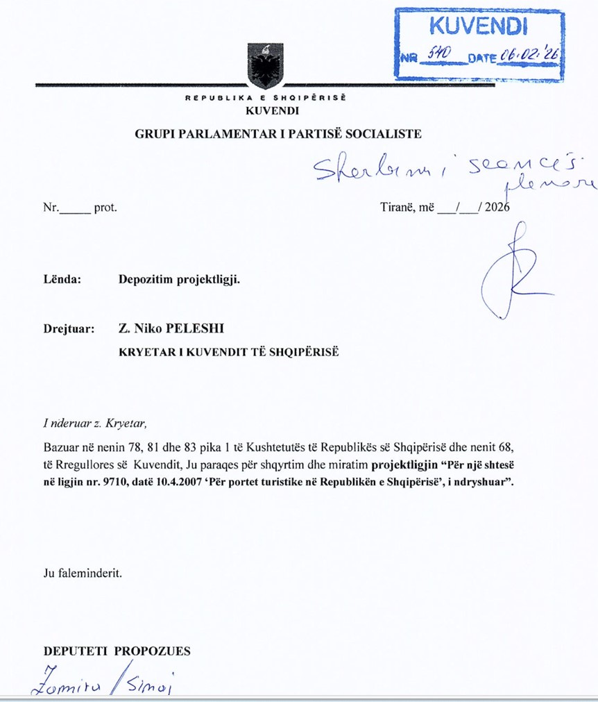 Deputetja e Vlorës nga radhët e Partisë Socialiste, Zamira Sinaj, ka depozituar më 6 shkurt projektligjin “Për një shtesë në ligjin nr. 9710, datë 10.4.2007, “Për portet turistike në Republikën e Shqipërisë”.