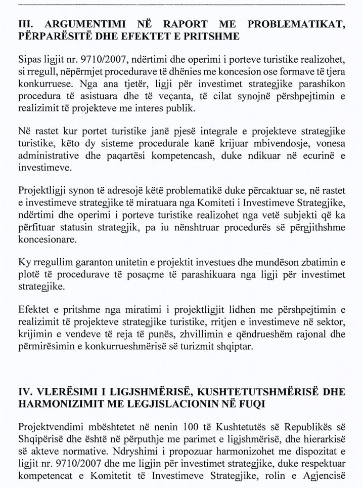 Por ndryshimi i “propozuar” nga deputetja Sinaj synon t’i japë një trajtim preferencial investitorëve që marrin statusin “strategjik”, duke u hapur rrugën që të ndërtojnë dhe operojnë porte turistike pa kaluar përmes garës koncesionare.