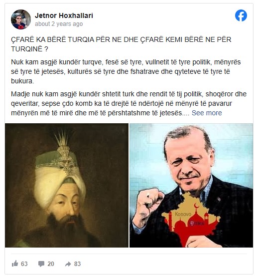 Dhe këtu turqit janë para nesh në çdo aspekt, prandaj meritojnë respekt dhe nder të veçantë. Por në fund të fundit, është punë e tyre. Për mua është e rëndësishme që shqiptarët që jetojnë atje të bëjnë një jetë dinjitoze. Por nëse dikush duhet të jetë mirënjohës për gjithçka që ka bërë pala tjetër, duhet të jenë turqit dhe jo ne shqiptarët. Dhe shteti turk na tregoi respekt ne shqiptarëve në shikim të parë kur njohu Kosovën, por për fat të keq më vonë e paguam shtrenjtë këtë shërbim. Gjithçka që pasoi ishte një përpjekje e vazhdueshme e Erdoganit për ta kthyer Kosovën në një vilajet turk.