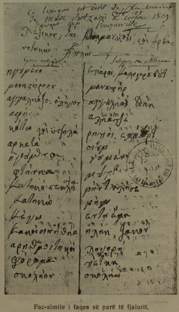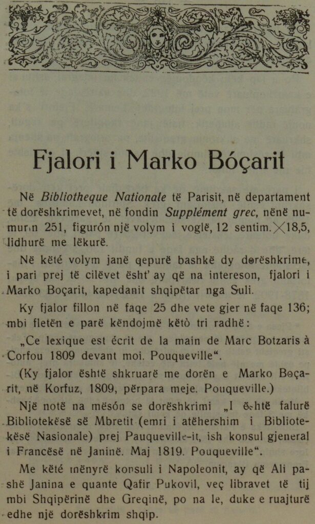 Pse një hero “grek” do të hartonte një fjalor për të mësuar shqipen, nëse ajo nuk do të ishte gjuha e tij amtare dhe e ushtarëve të tij? Ky fjalor u hartua me kërkesën e konsullit francez Pouqueville, i cili vërejti se suliotët e kishin të vështirë të komunikonin me grekët pa ndërmjetësimin e shqipes.
