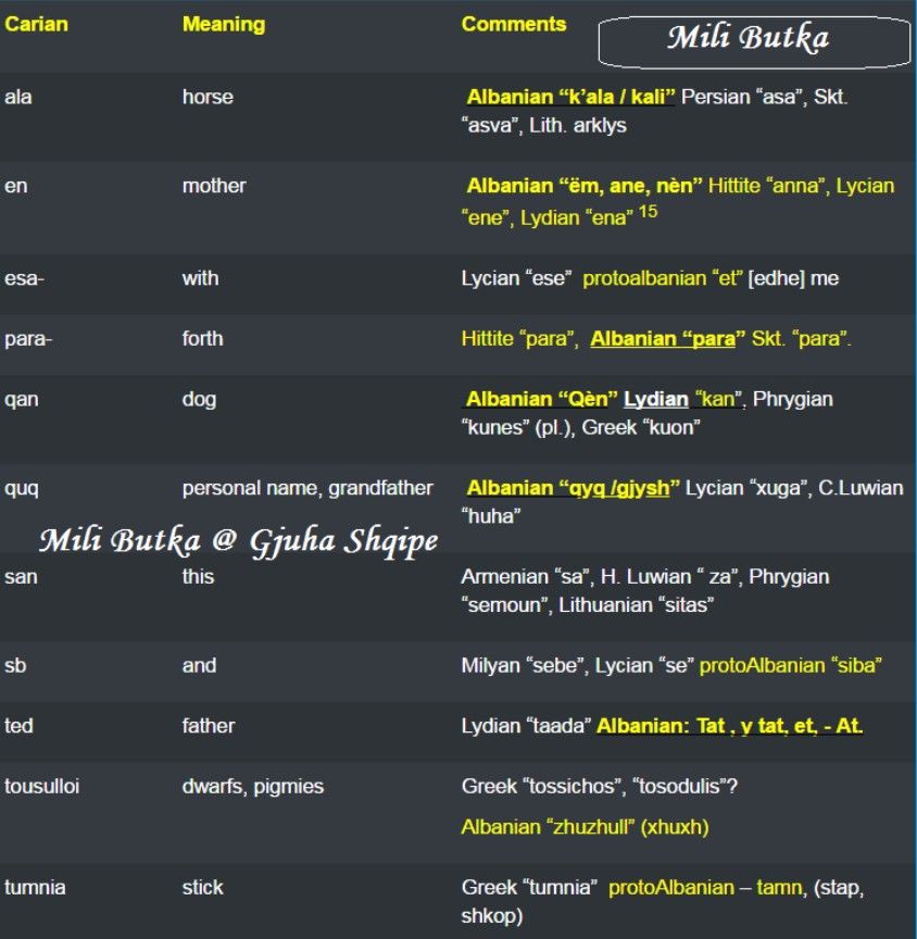 Më poshtë ju do të gjeni disa fjalë Cariane dhe lidhjen e tyre me gjuhët e tjera indo-evropiane. Vini re gjuhën shqipe e njëjtë fiks me ate Cariane.