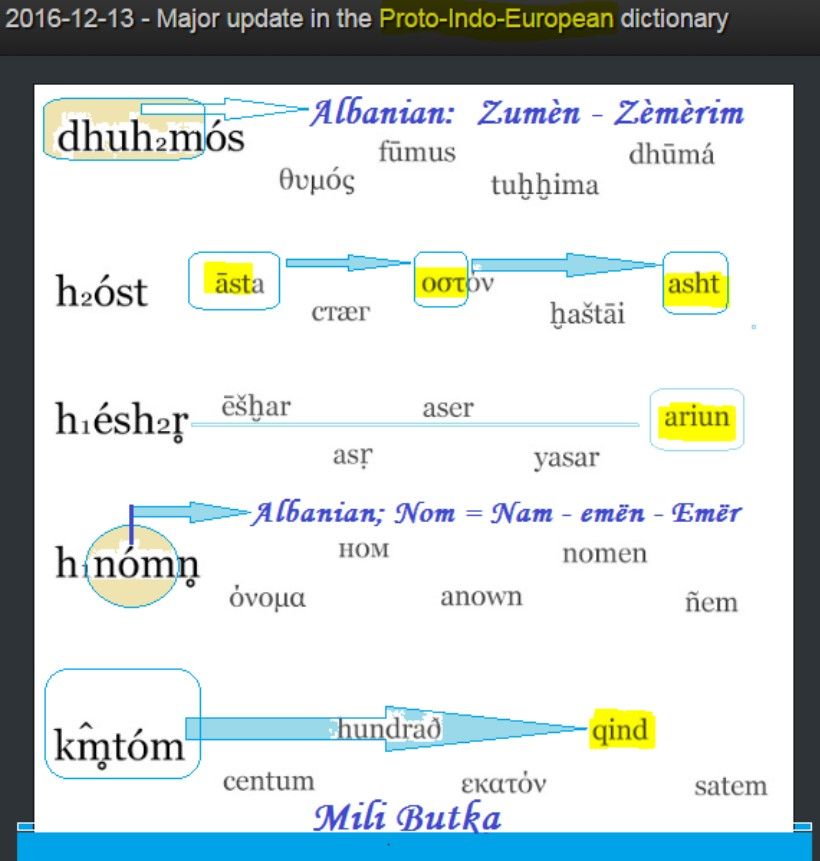 Tek kjo tabelë vini re me kujdes disa fjalë të lashta PIE – të cilat gjenden ende pastër tek gjuha shqipe, pa haruar evoluimin e shkronjave llogjike dhe me bazë shkencore përcaktuar ashtu e njëjtë kjo për të gjitha gjuhët e tjera e tjera në përdorim; psh: kemi kalime te tilla si : d/t/s = ds/x/z ashtu si: Ts = c/ç, etj.
