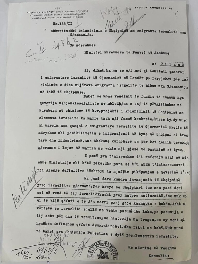 Konsulli shqiptar në Vjenë kërkon që ndaj planit për ta kthyer Shqipërinë një Izrael të dytë, qeveria shqiptare të mbante një qëndrim të prerë, sepse, sipas tij, një vend që hynte nën influencën e tyre demoralizohej. Ai thekson, ndoshta i ndikuar nga propaganda e atyre viteve që shqiptari për nga natyra ishte antisemit. Në fakt, kjo nuk ishte e vërtetë. Në këtë periudhë apo edhe gjatë LDB shteti dhe populli shqiptar do të japë një kontribut të jashtzakonshëm për shpëtimin e hebrenjve.