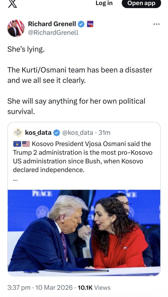 Grenell ka thënë se “Osmani po gënjen”, duke thënë se ajo bashkë me Kurtin kanë qenë një “ekip i tmerrshëm”.
