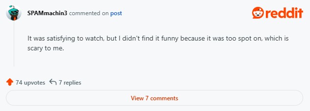 “It was satisfying to watch,” remarks one user in a Reddit thread about the skit, “but I didn’t find it funny because it was too spot on, which is scary to me.”