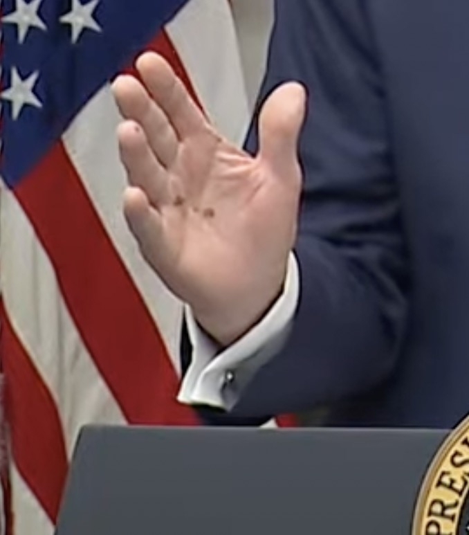 While announcing a $100 billion investment in the US from Taiwan Semiconductor Manufacturing Company, Trump’s expressive hand gestures inadvertently revealed the new dark markings.