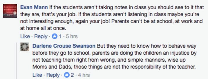 “As a retired teacher, I am sick of people who know nothing about public schools or have not been in a classroom recently deciding how to fix our education system. The teachers are not the problem! Parents are the problem! They are not teaching their children manners, respect or even general knowledge of how to get along with others. The children come to school in shoes that cost more than the teacher’s entire outfit, but have no pencil or paper. Who provides them? The teachers often provide them out of their own pockets.