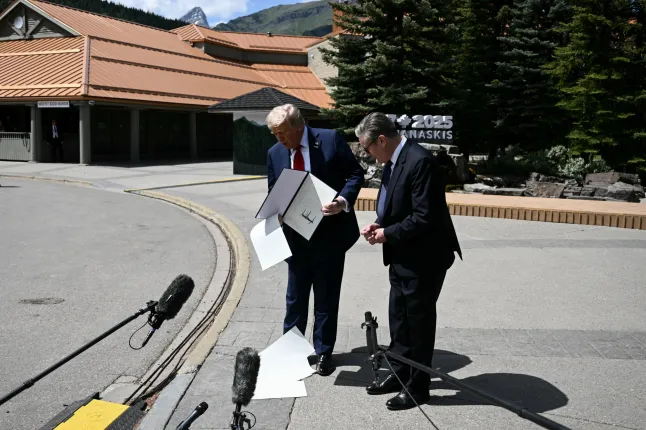 Starmer and Trump presented a copy of the trade deal that they had announced in May, during the Group of Seven (G7) Summit at the Pomeroy Kananaskis Mountain Lodge in Alberta, Canada, on Monday.