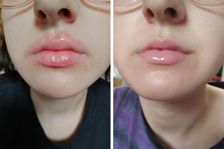 3. “I have eczema around my lips. On the left is what they look like if I use Vaseline on them, on the right if I use the lip sleep mask. It’s my salvation.”
