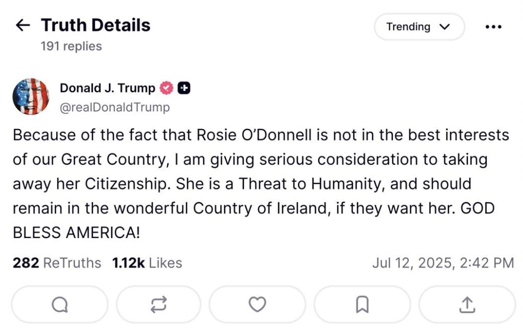 Trump, 79, wrote: “Because of the fact that Rosie O’Donnell is not in the best interests of our Great Country, I am giving serious consideration to taking away her Citizenship. She is a Threat to Humanity, and should remain in the wonderful Country of Ireland, if they want her. GOD BLESS AMERICA!”