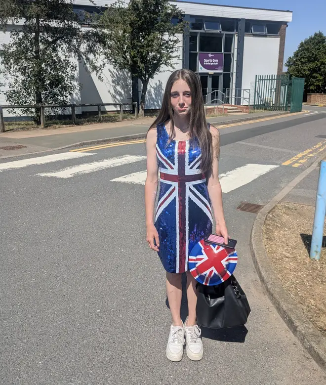 Student Courtney Wright wore the sequinned union flag dress as part of the school’s celebration on Friday.
