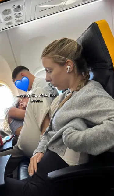While he’s on the other side of the aisle, his girlfriend has been seated next to a couple who’s taking PDA to the next level.
