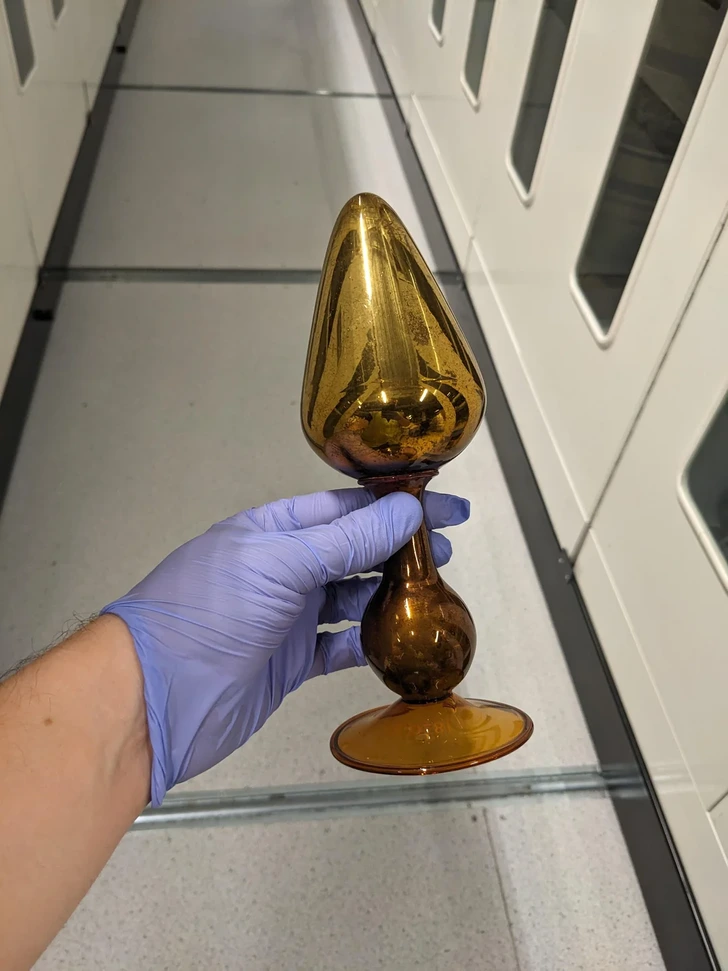 “Golden coloured opaque glass object about 25cm tall. Weights about 40g. Hollow with no holes.”