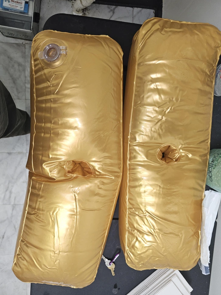 “What are these? They are plastic, gold, and appear to be inflatable or fillable. They are filled with water and the holes in the middle go all the way through.”