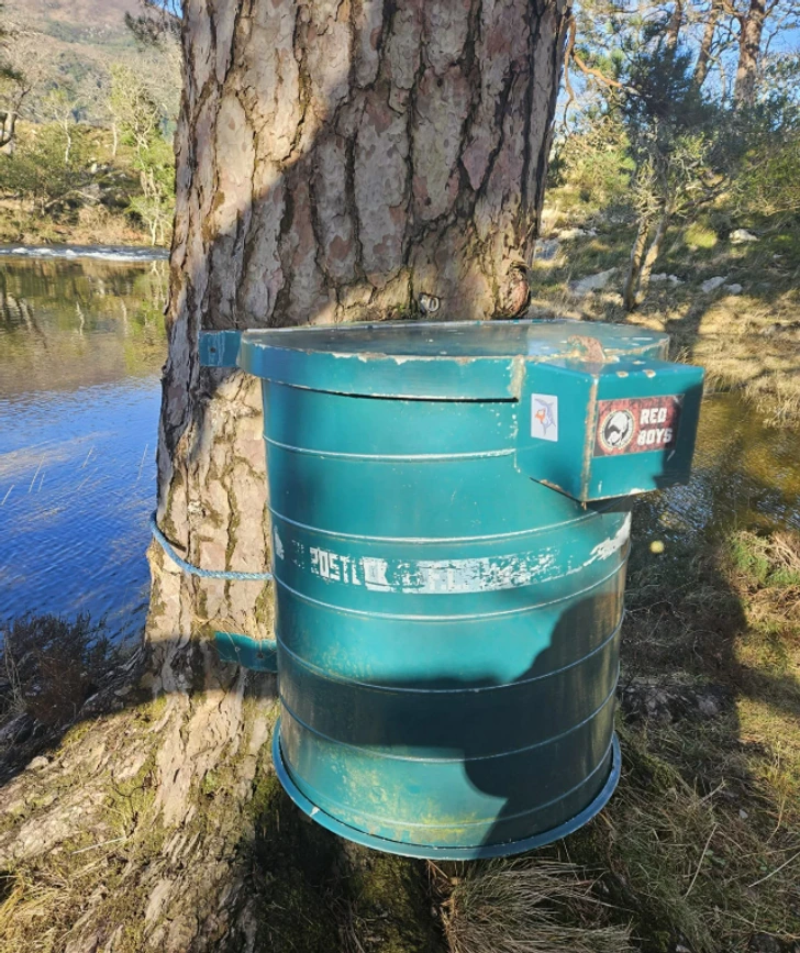 “Green metal barrel on a tree next to a river in the woods in Ireland. With a lock underneath. What could it be?”