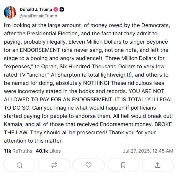 ‘Kamala and all of those that received endorsement money BROKE THE LAW. They should all be prosecuted! Thank you for your attention to this matter.’
